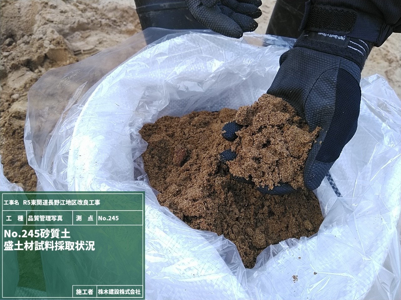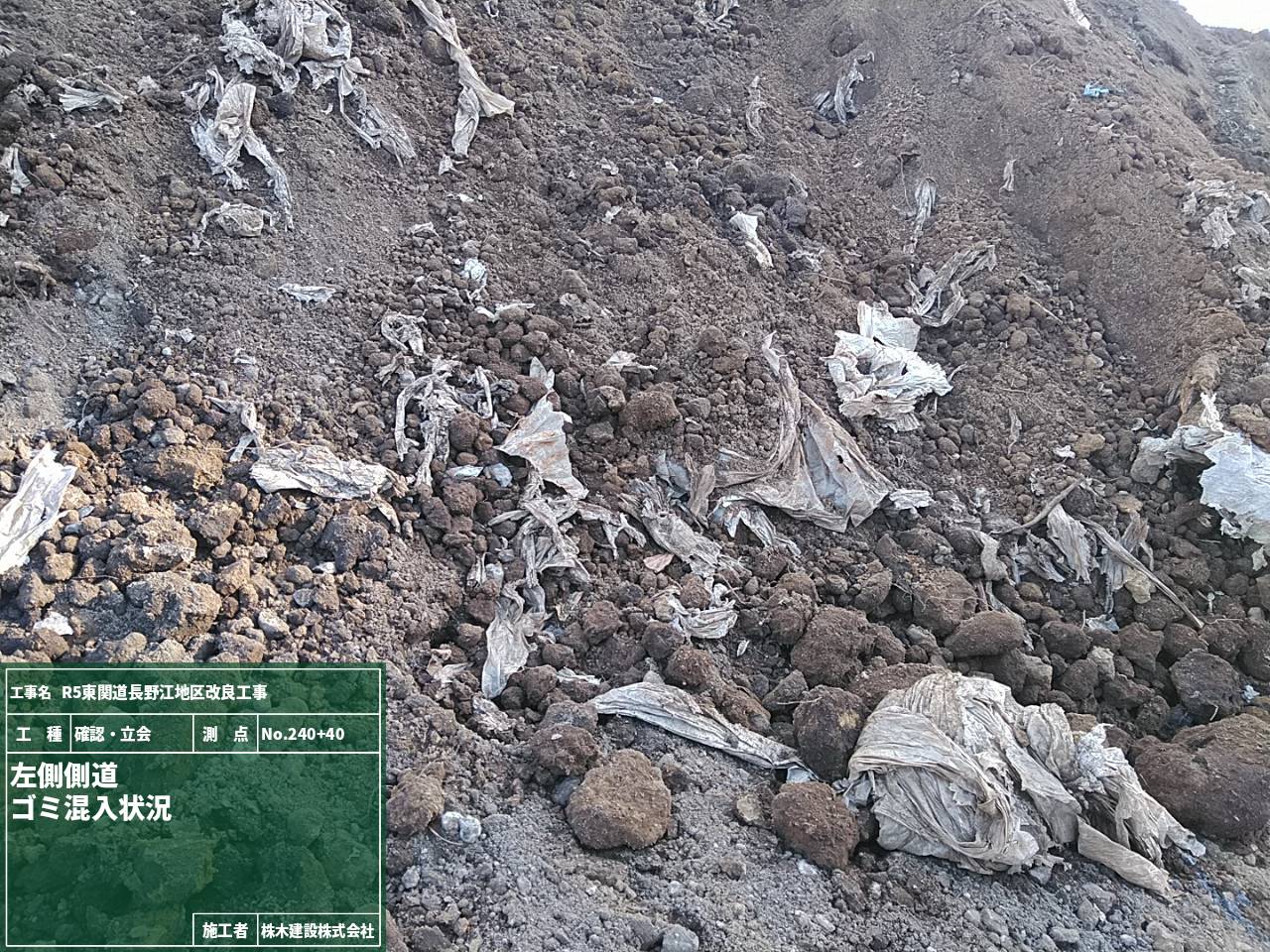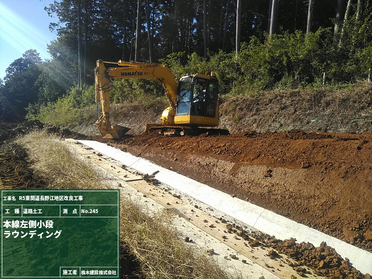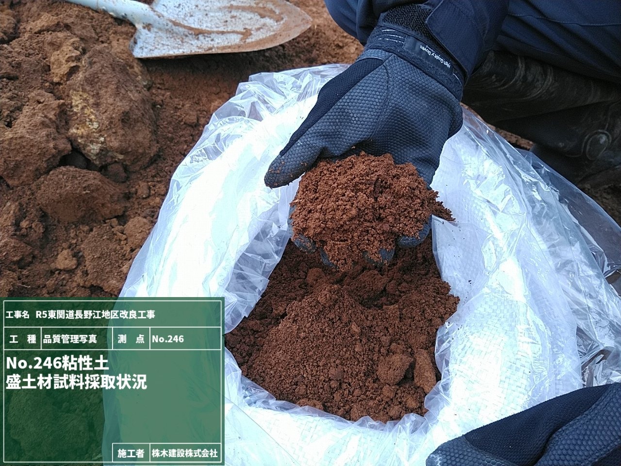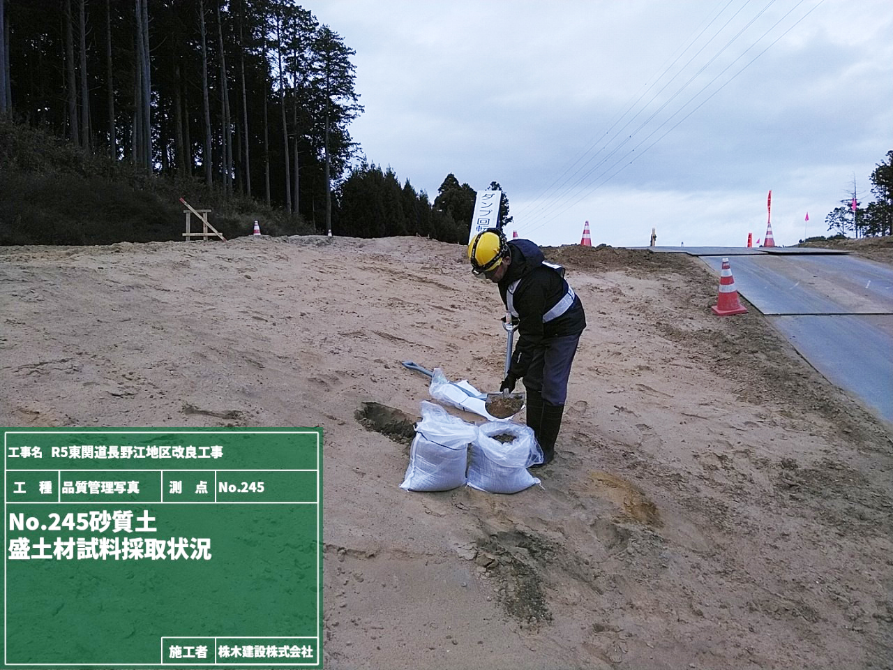 盛土施工前に材料が盛土に適したものか土質試験を実施するためにNo.245とNo.246の地点で試料を採取している様子です。