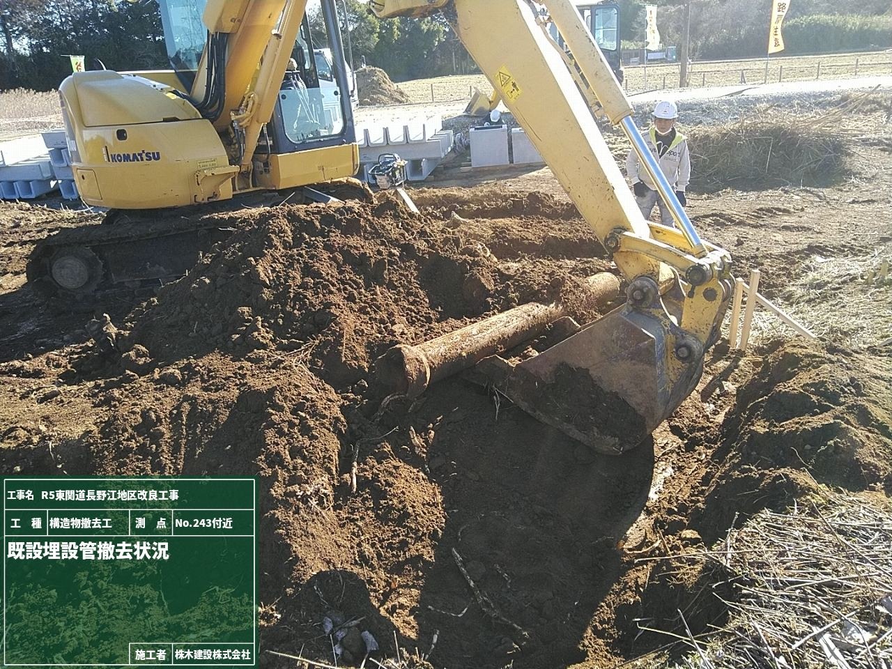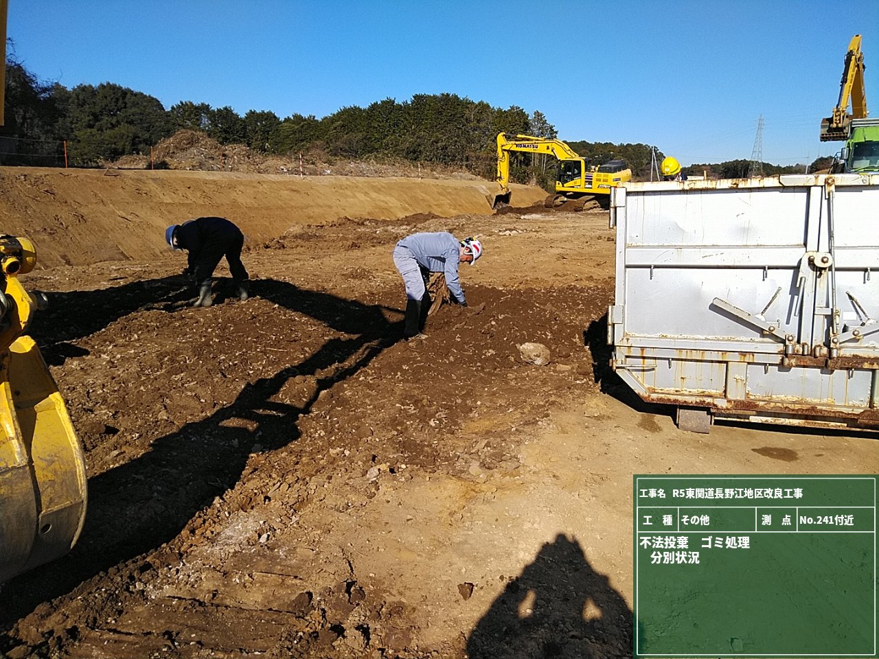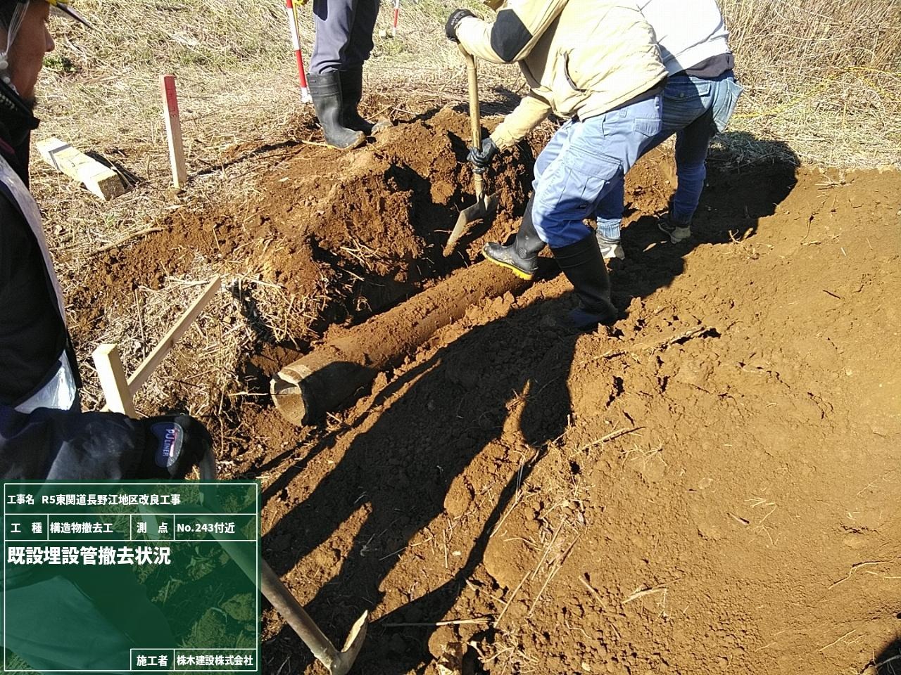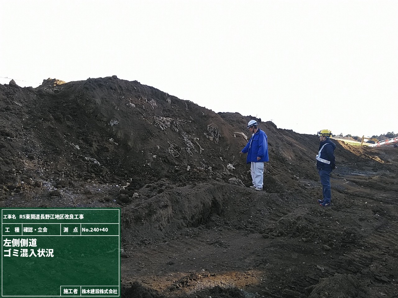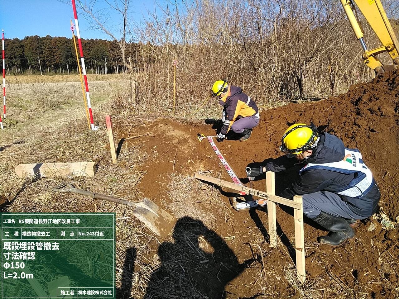 盛土施工前に材料が盛土に適したものか土質試験を実施するためにNo.245とNo.246の地点で試料を採取している様子です。