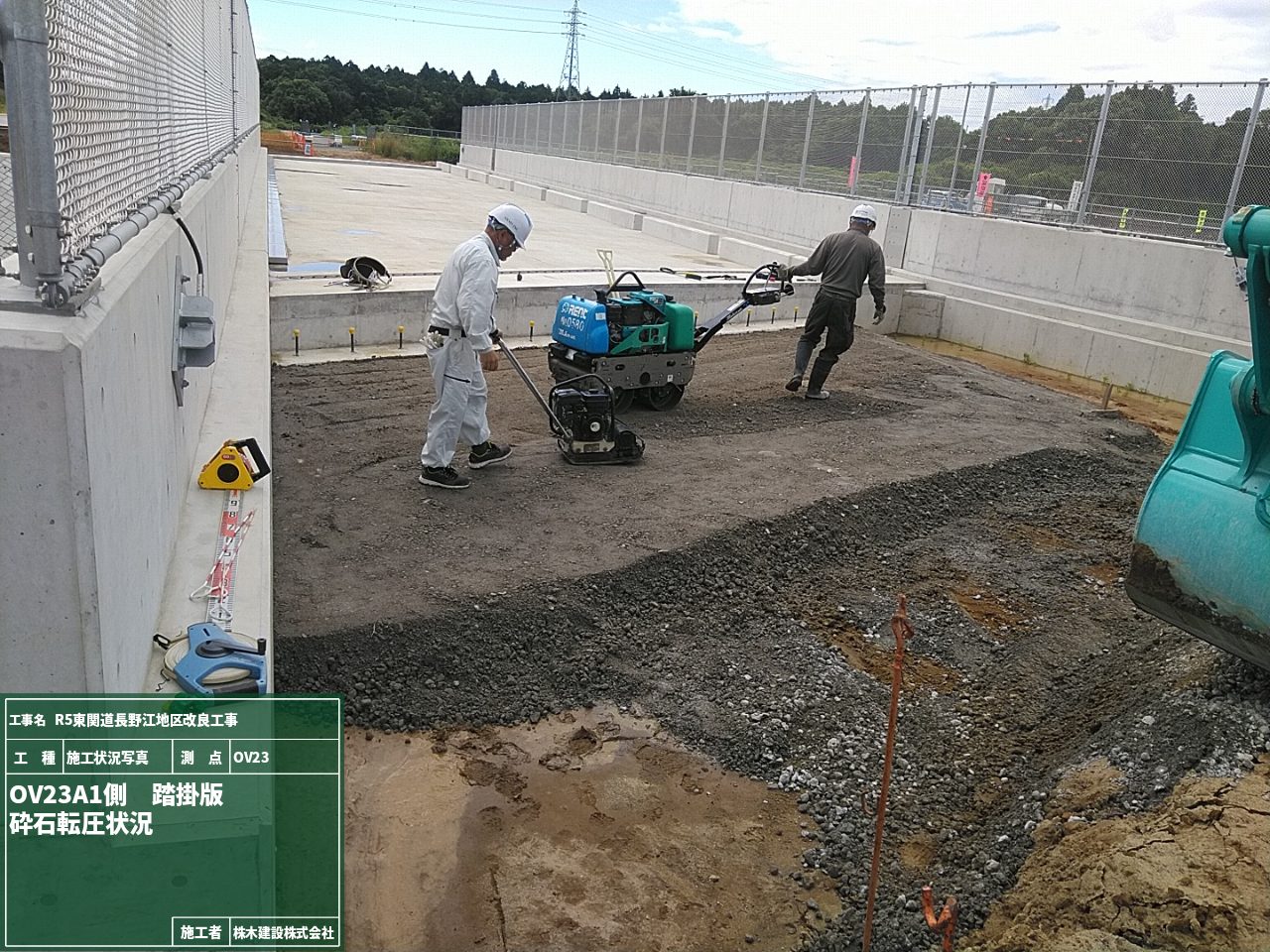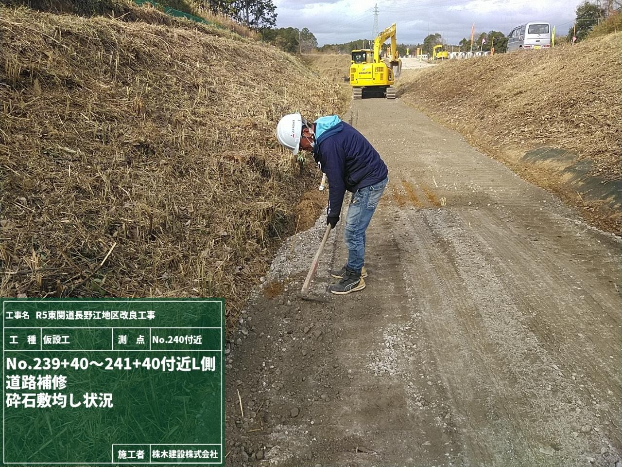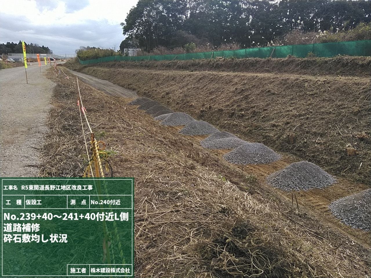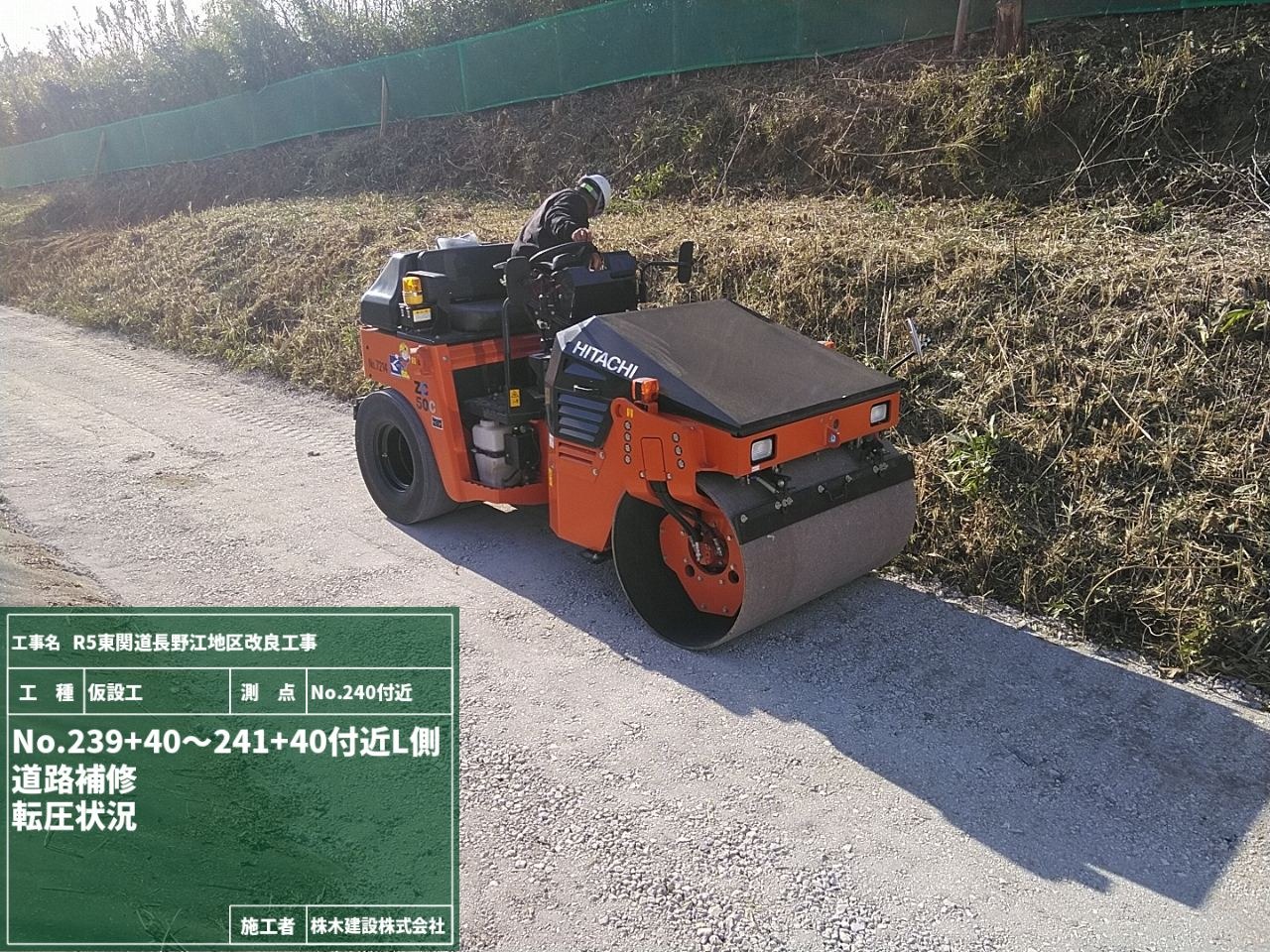 そして並行して道路補修作業、砕石材を荷下ろしして敷き均し転圧作業の工程です。