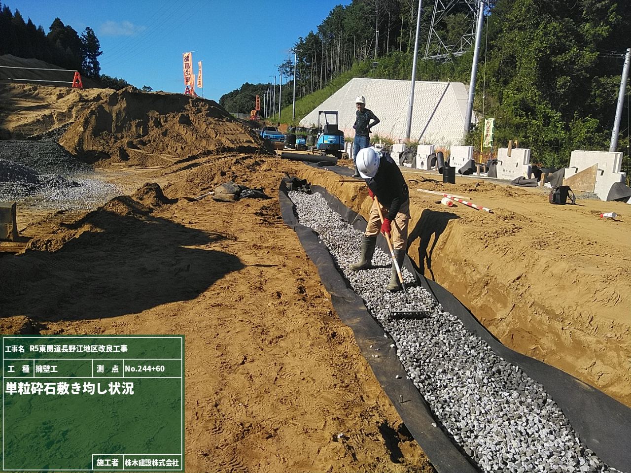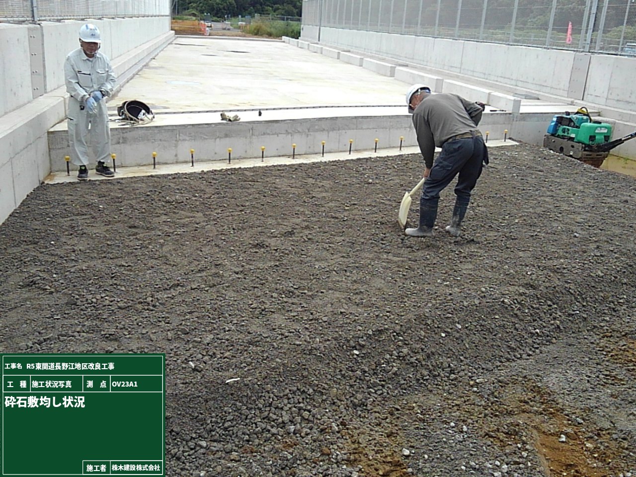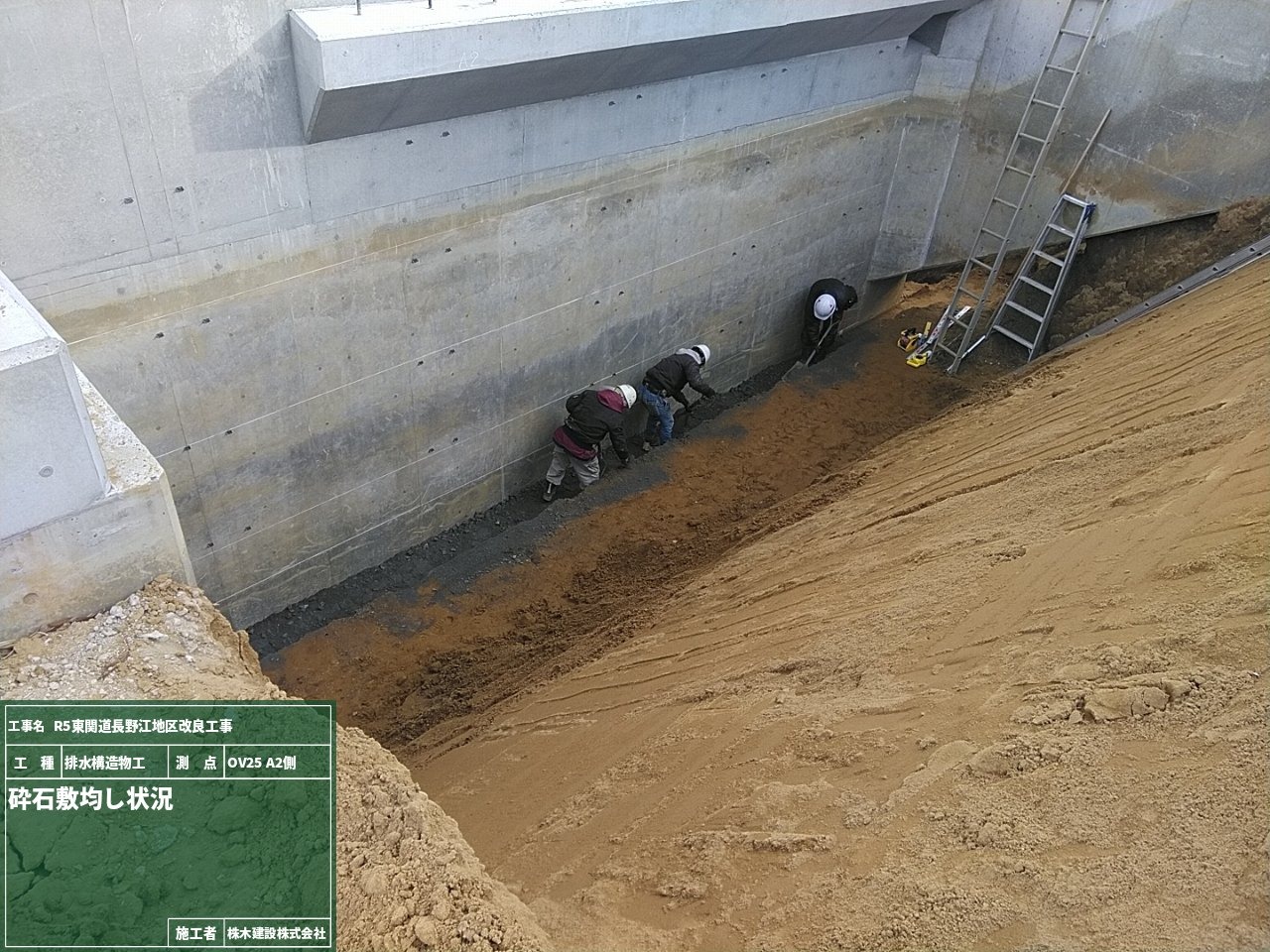 まずは、側溝の下に砕石を敷き詰めて平らにする砕石敷均しの工程です。