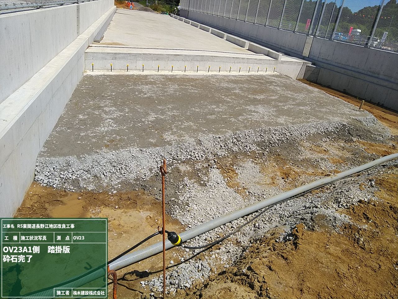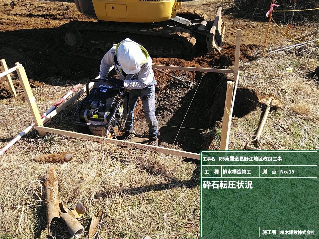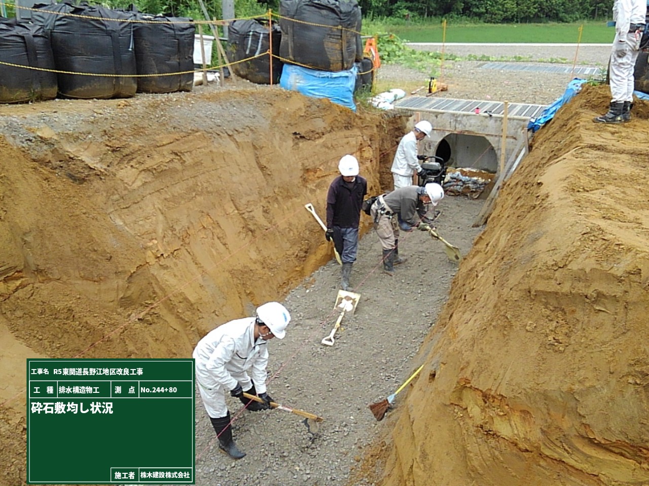 まずは、側溝の下に砕石を敷き詰めて平らにする砕石敷均しの工程です。