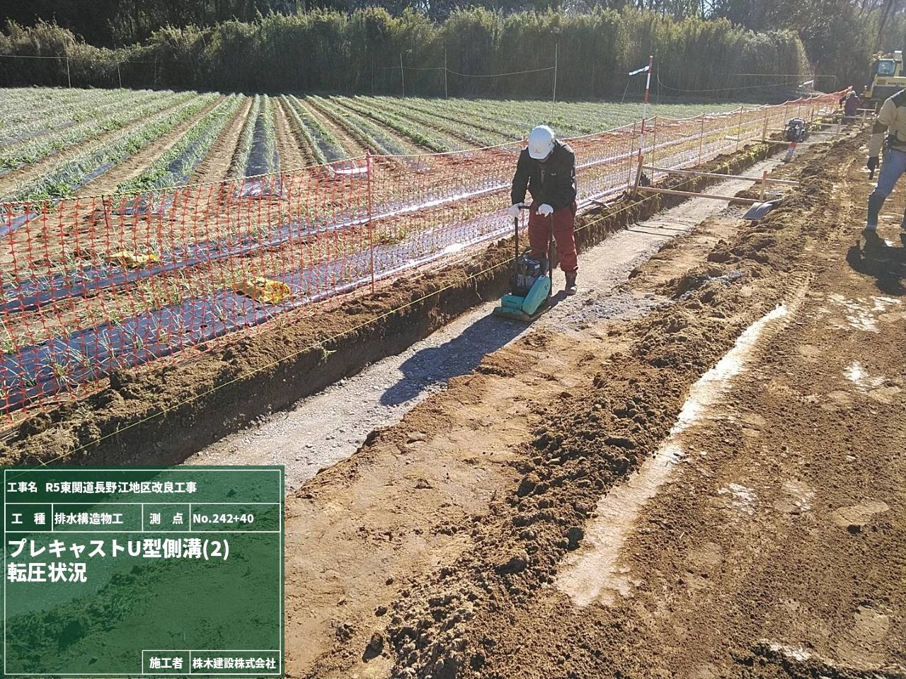 基礎材を敷き均し転圧作業を行いプレキャストU型側溝を布設します。