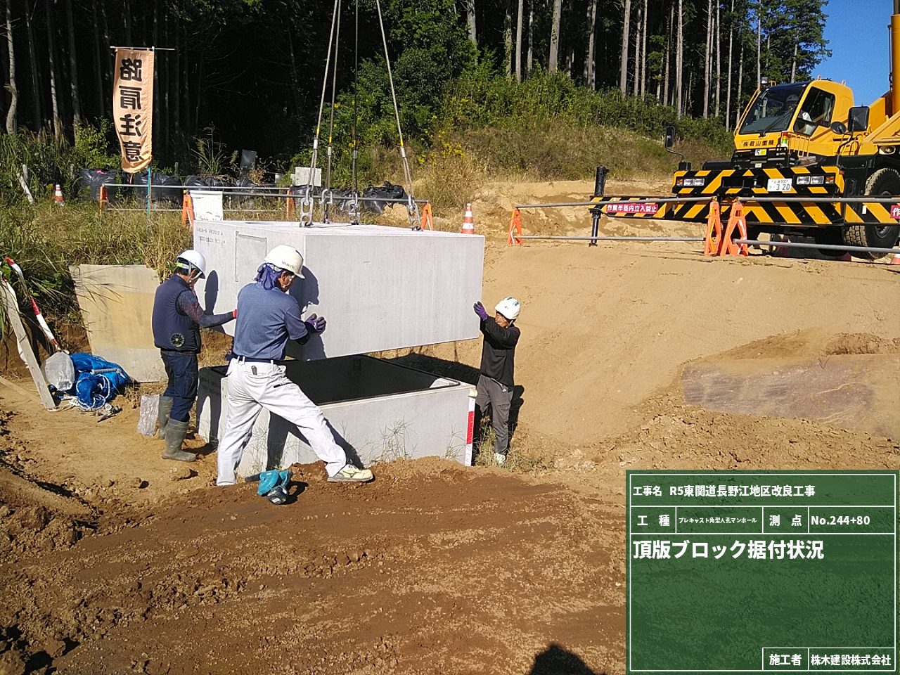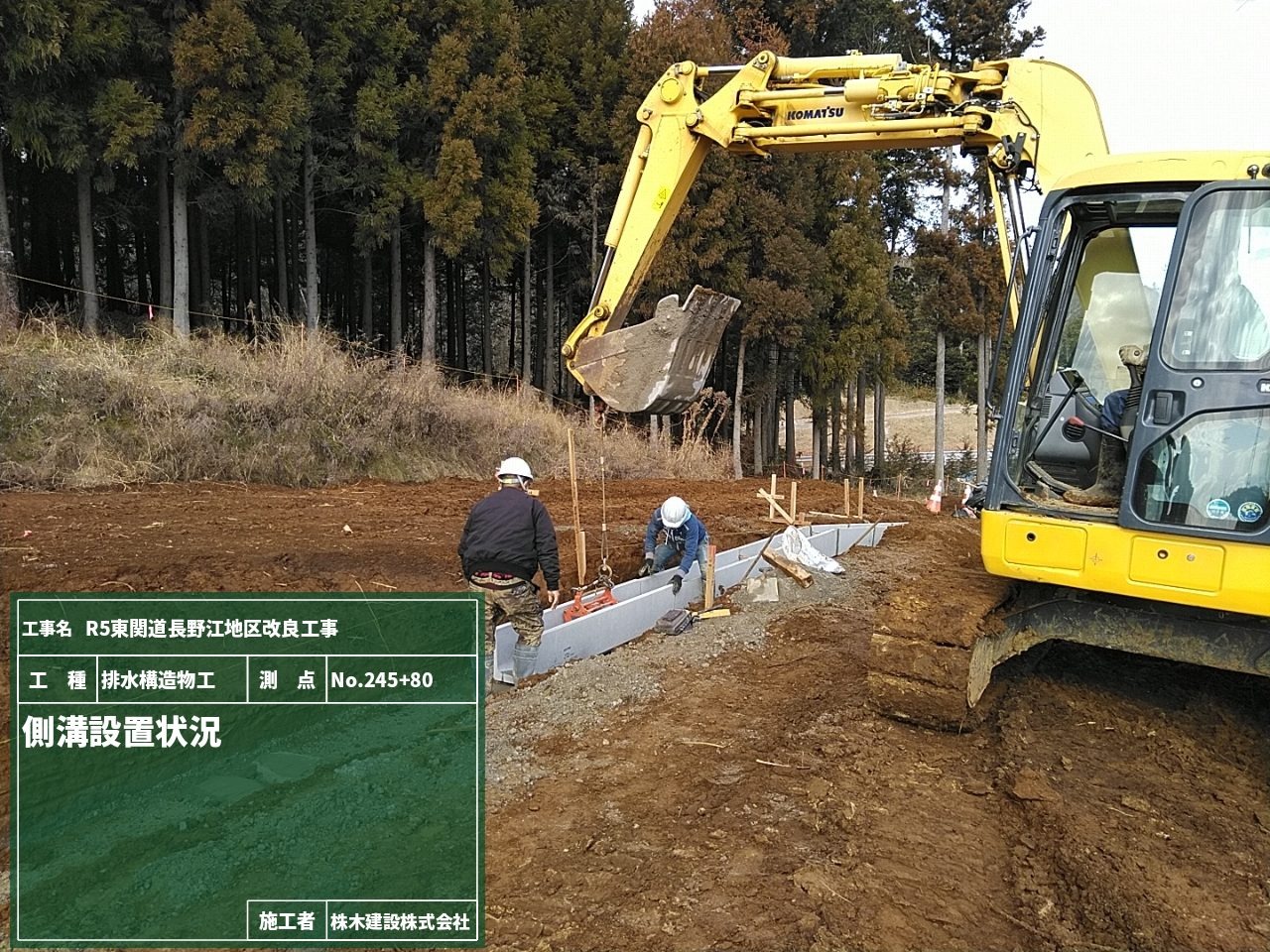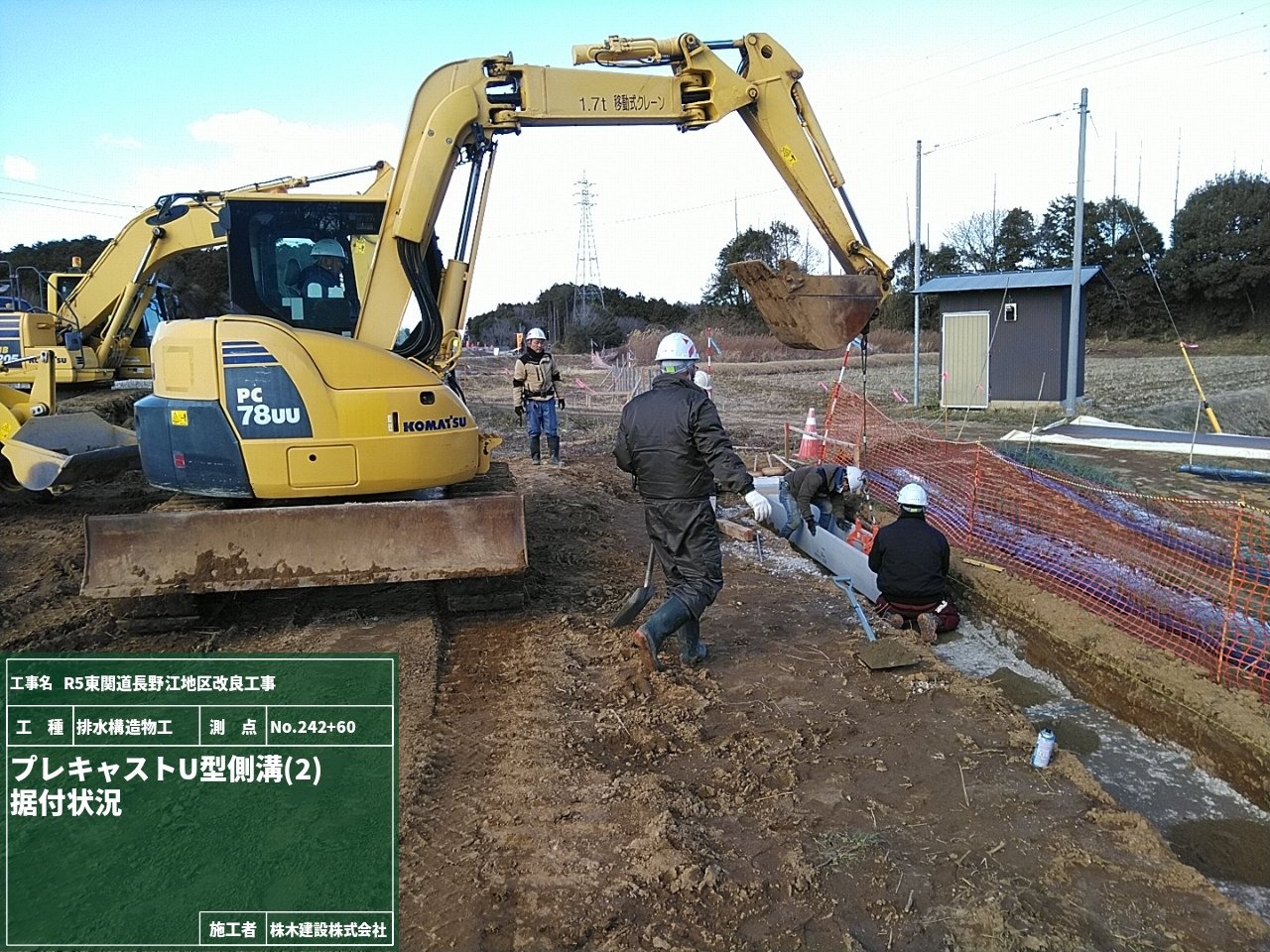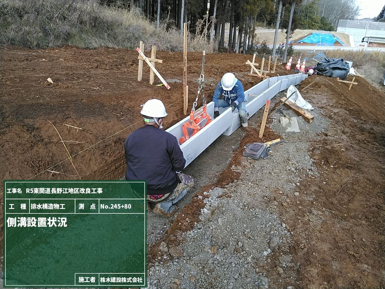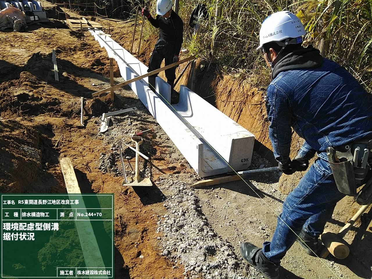 現場ではプレキャストU型側溝の布設作業に入りました。
