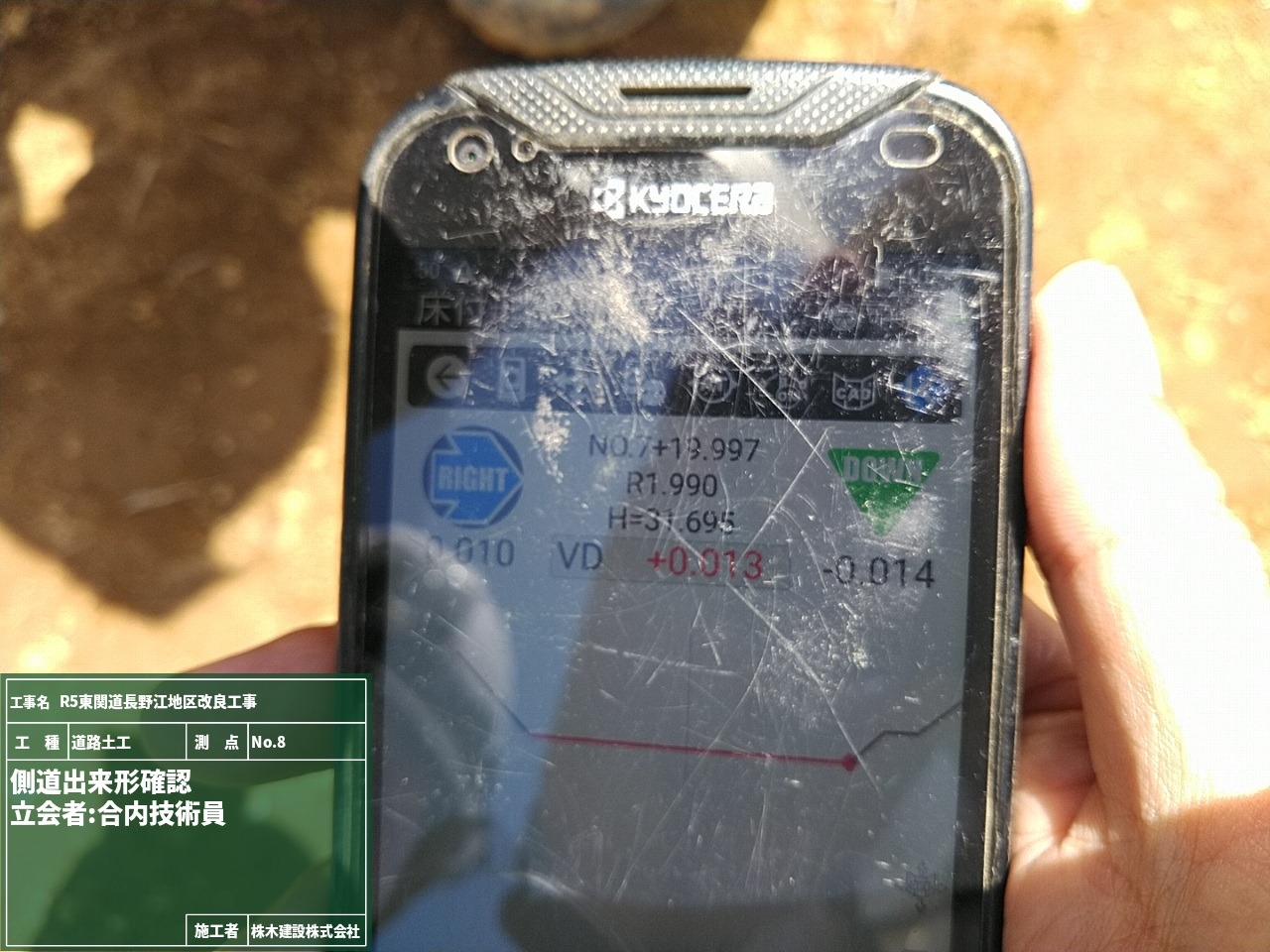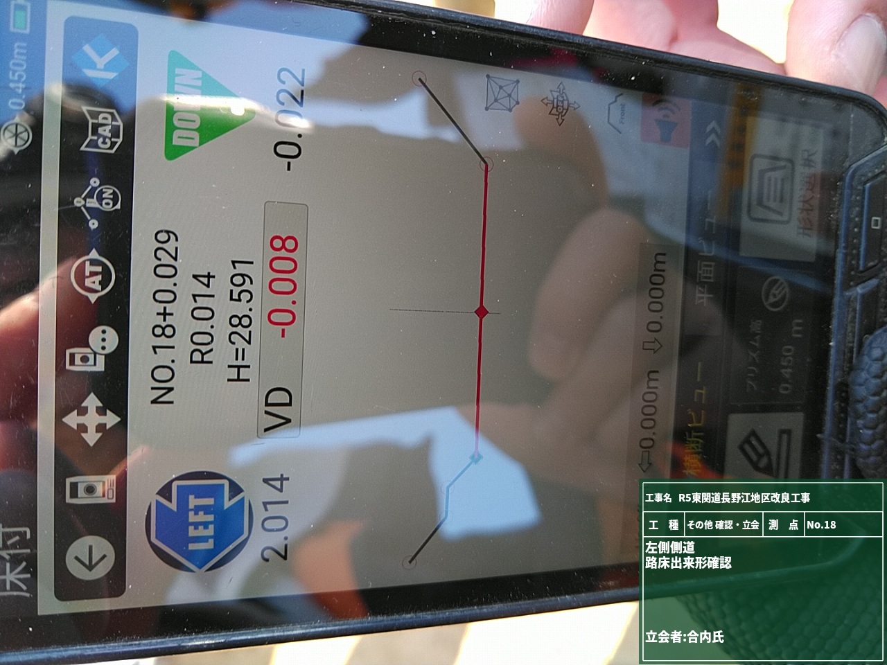 施工データとの離れや標高差を常に表示させながら出来形確認を行えるので、リアルタイムで数値が分かります。