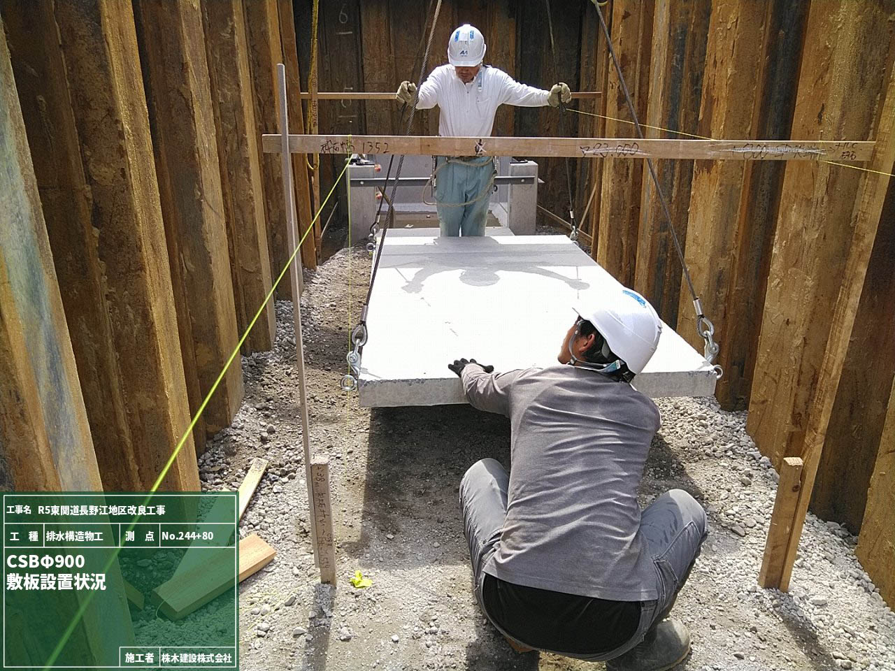 砕石敷均しの後は、バックホウで吊下げて敷板を設置していきます。