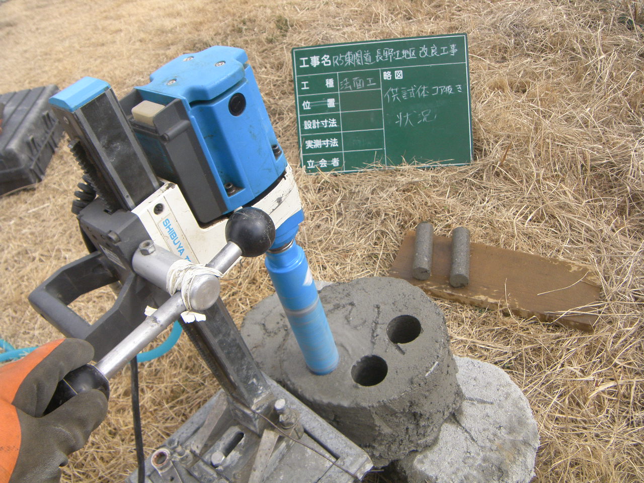 養生期間を置いた後は、いよいよ供試体のコア抜きです。