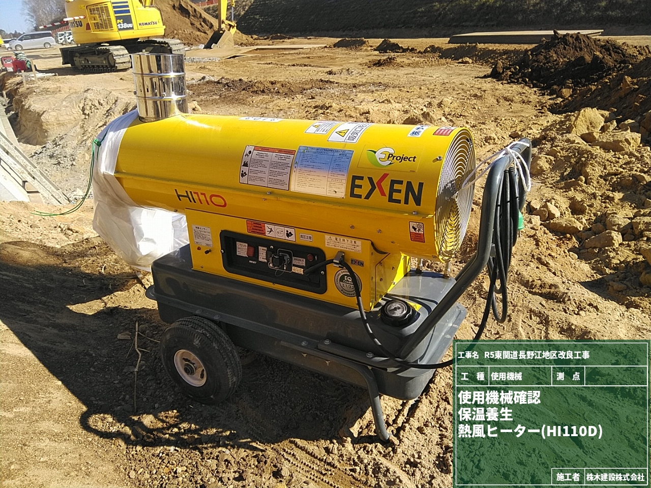 そこで登場したのが黄色が眩しい熱風ヒーターです!これを使って保温養生をします。