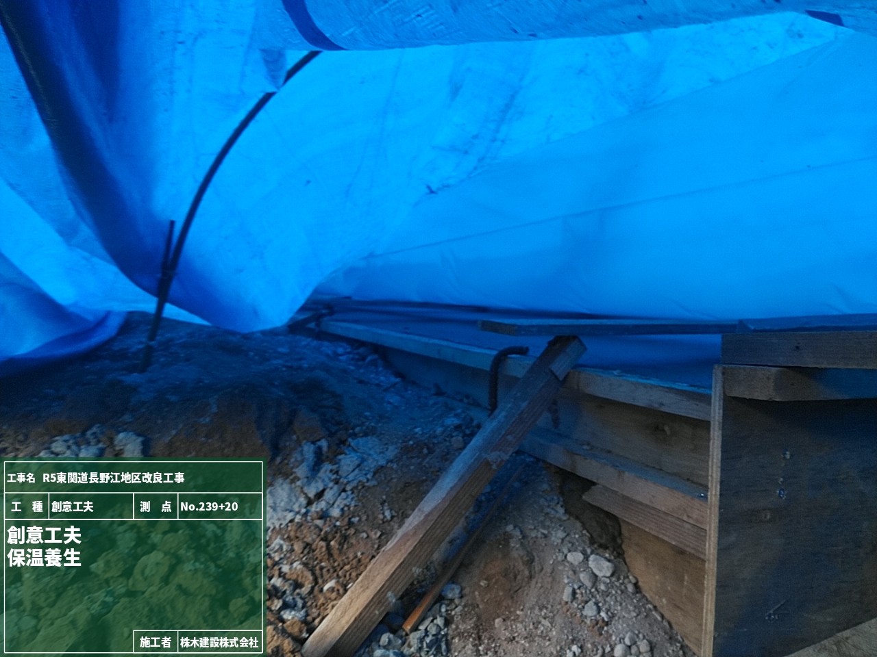 打込んだコンクリートをブルーシートなどで囲い、その内部を暖めます。